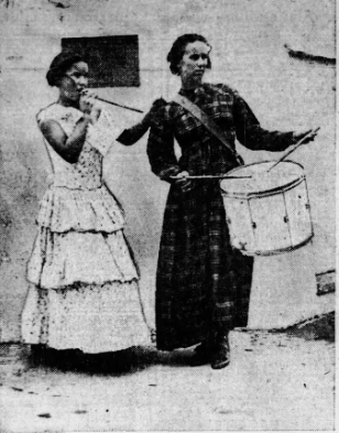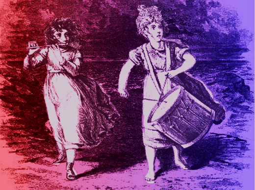 Rebecca Bates (left) and Abigail Bates (right) playing fife and drum. (illustration: New England Historical Society)