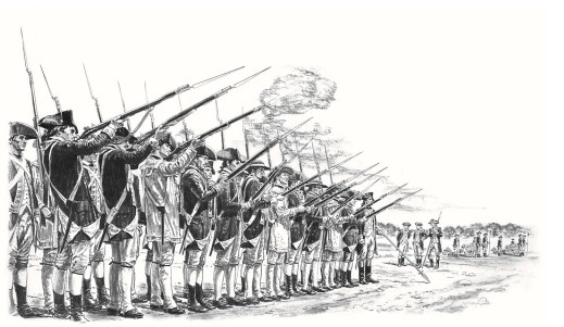 Continental and state troops perform a feu de joie (“fire of joy.”) Cannon smoke rises in the background, and a roar of muskets fire across the Grand Parade, as they celebrate the first anniversary of The Declaration of Independence. (artist: Ed Vebell, drawing: National Park Service). AI Image Enhanced